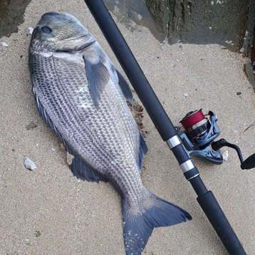 Tides pushing hard now so just a short flick into a close deep hole, rod gets pulled flat, drag screams, braid slices fingers, reminding me to buy new gloves, steady run of about 30m, feels like a good fish, don't touch the drag, just work him back to me slowly and using the waves keep him away from the outer reef, he slides past me into a deeper hole, still can't see the fish, but if this is a blacktail its huge. Then that unmistakable shape of good size musselcracker, gently lift him out of the deep water and onto the ledge. So stoked!
